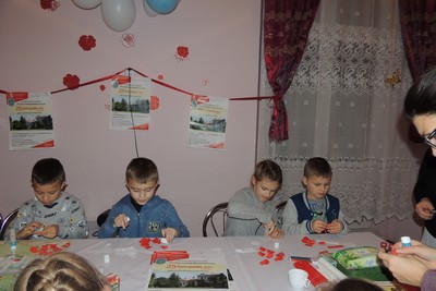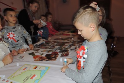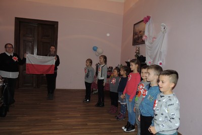 Równie ciekawe i inspirujące były „Spotkania z historią” dla przedszkolaków, dzieci i młodzieży. Dzieci wraz z rodzicami w sposób miły i przyjemny wykonywały kotyliony, zrobiły mapę Polski, śpiewały hymn jak również bawiono się w stare zabawy:mam chusteczkę haftowaną, kto ty jesteś itp., Były też konkursy z nagrodami i wspólna zabawa.