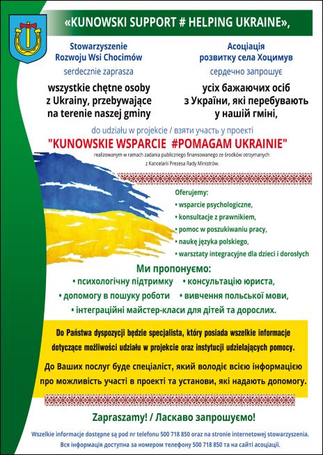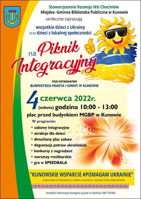 W dniu 4 czerwca 2022 roku w Miejsko - Gminnej Bibliotece w Kunowie odbył się Piknik Integracyjny Polsko - Ukraiński, połączony z Dniem Dziecka. Projekt "Kunowskie wsparcie # Pomagam Ukrainie, realizowany jest przez Stowarzyszenie Rozwoju Wsi Chocimów, dzięki dotacji otrzymanej z Kancelarii Prezesa Rady Ministrów. Piknik zorganizowany został we współpracy z Miejsko - Gminną Bibliotekę Publiczną w Kunowie pod patronatem Burmistrza Miasta i Gminy Kunów Pana Lecha Łodeja.